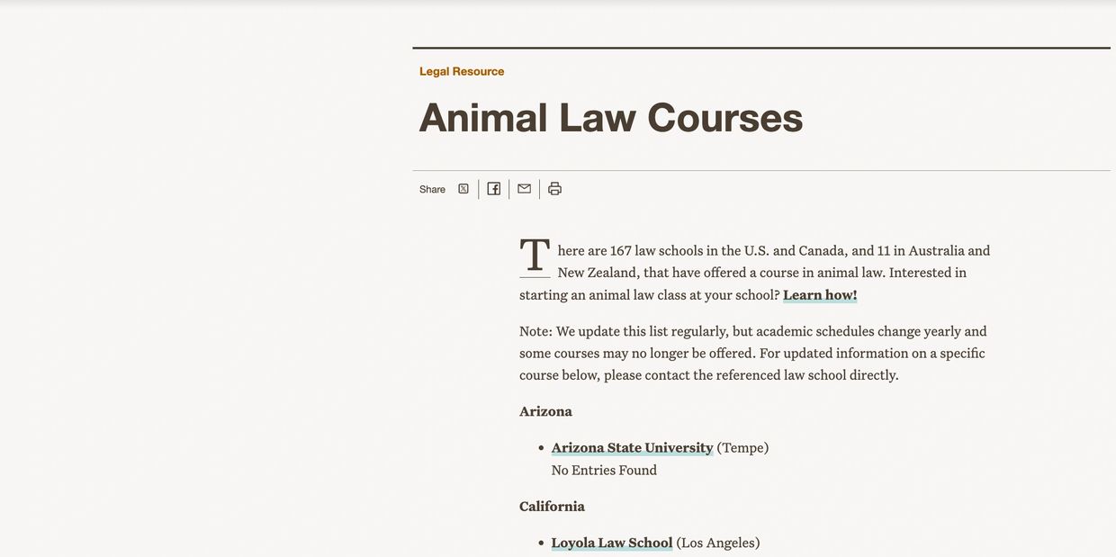 "Most Canadian law schools now offer an animal law course, although it may not be available every year—sometimes animal law is offered in alternate years. Here’s a list of schools with an animal law course. For more information, we suggest contacting the institution." The list of includes: 1) University of Victoria Faculty of Law, 2) University of British Columbia, Peter A. Allard School of Law, 3) University of Alberta Faculty of Law, 4) Robson Hall, Faculty of Law at the University of Manitoba, 5) University of Windsor Faculty of Law, 6) University of Toronto Faculty of Law, 7) University of Ottawa Faculty of Law, 8) Queen’s Faculty of Law and several others. Contact the individual law schools for current information.