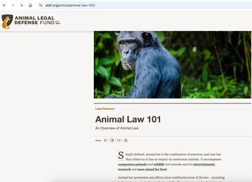 "Animal law is the combination of statutory and case law that relates to or has an impact on nonhuman animals. It encompasses companion animals and wildlife and animals used in entertainment, research and ones raised for food.Animal law permeates and affects most traditional areas of the law – including tort, contract, criminal, constitutional, family, environmental, administrative, and trust law. The Animal Legal Defense Fund’s (ALDF) Animal Law Academy https://aldf.org/article/animal-law-academy/ provides articles, educational webinars, and CLEs covering both substantive and practical topics in animal law."